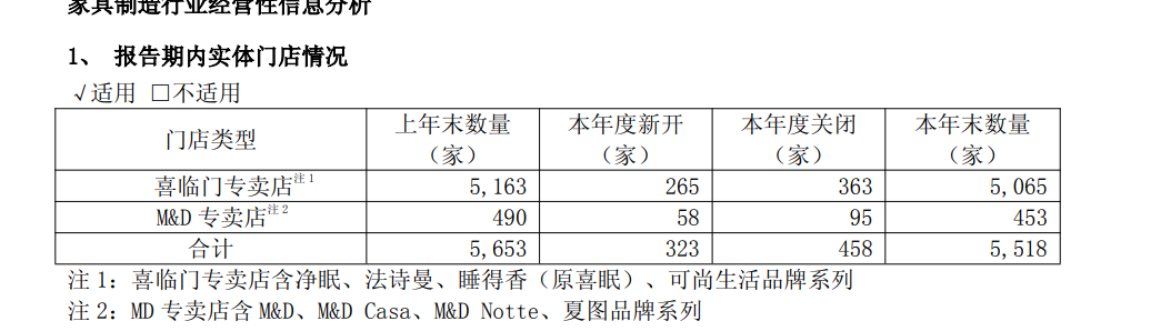 喜临门主要销售渠道有自主品牌零售渠道、自主品牌工程渠道和OEM 业务渠道。截至报告期末,自主品牌专卖店分布已超5000家。具体来看,喜临门专卖店达5065家,M&D专卖店453家。